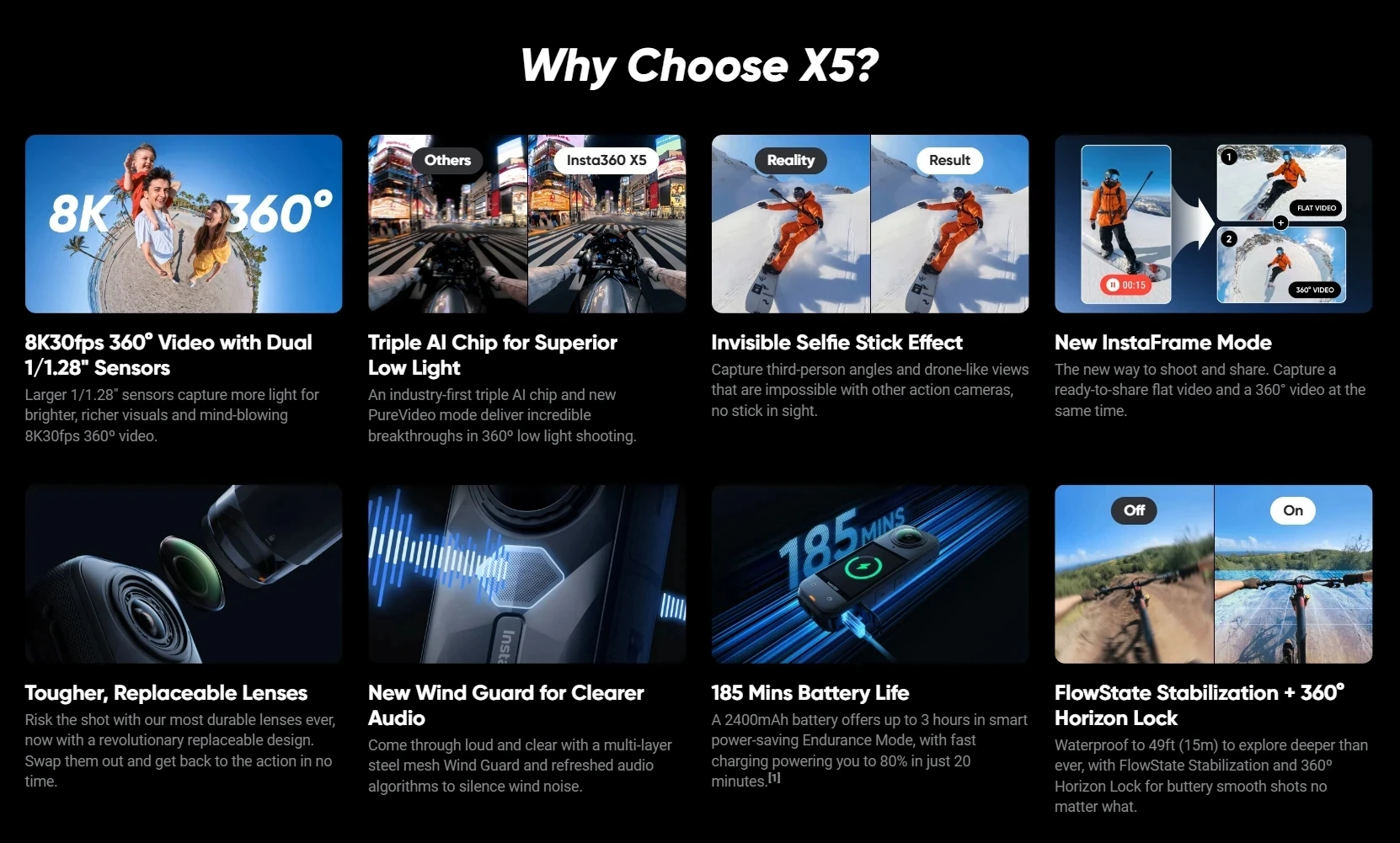 Insta360 X5 15m Waterproof Now arrival 72MP 360° Video X5 Action Camera New Wind Guard 185 mins Run Time Newest